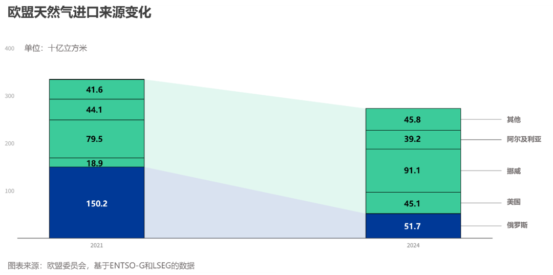 来自美国、挪威的石油天然气在欧盟进口油气总量的占比大幅提升。2024年,欧盟从美国的进口液化天然气量是2021年的两倍多,美国成为欧盟最大的液化天然气供应国,占欧盟液化天然气进口总量的近45%。欧盟目前最大的天然气供应国是挪威,其2024年提供了欧盟全部天然气进口量的33%以上。