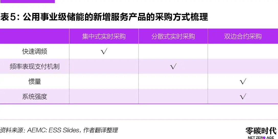 上表中涉及公用事业级储能的新增服务产品的采购方式不同,总结见表5。