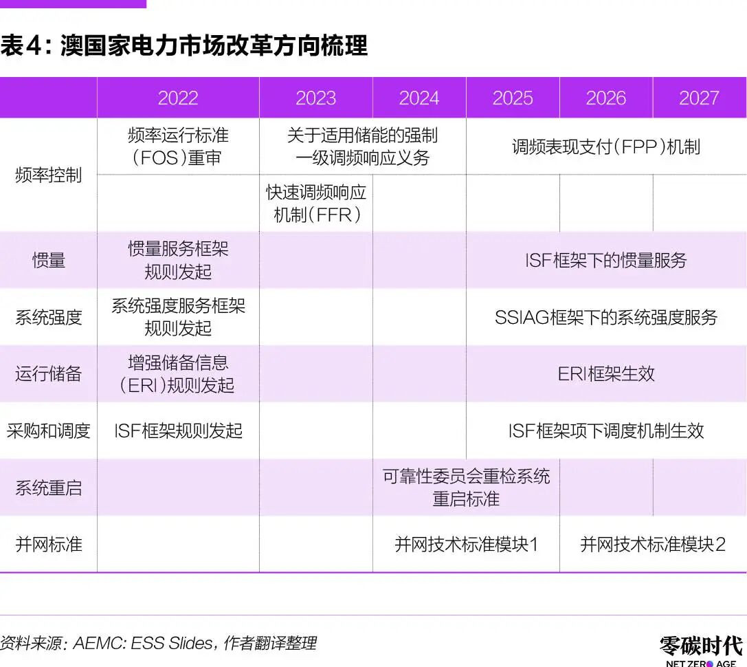 近年来,澳国家电力市场的系统安全框架一直保持动态修订的状态,不断新增储能相关的服务产品和合约方式,持续挖掘储能的价值潜力:如2025年6月生效的频率性能支付机制(FPP)、12月生效的系统强度采购和惯量采购机制,持续挖掘公用事业级储能的服务价值。各类改革主线见表4。