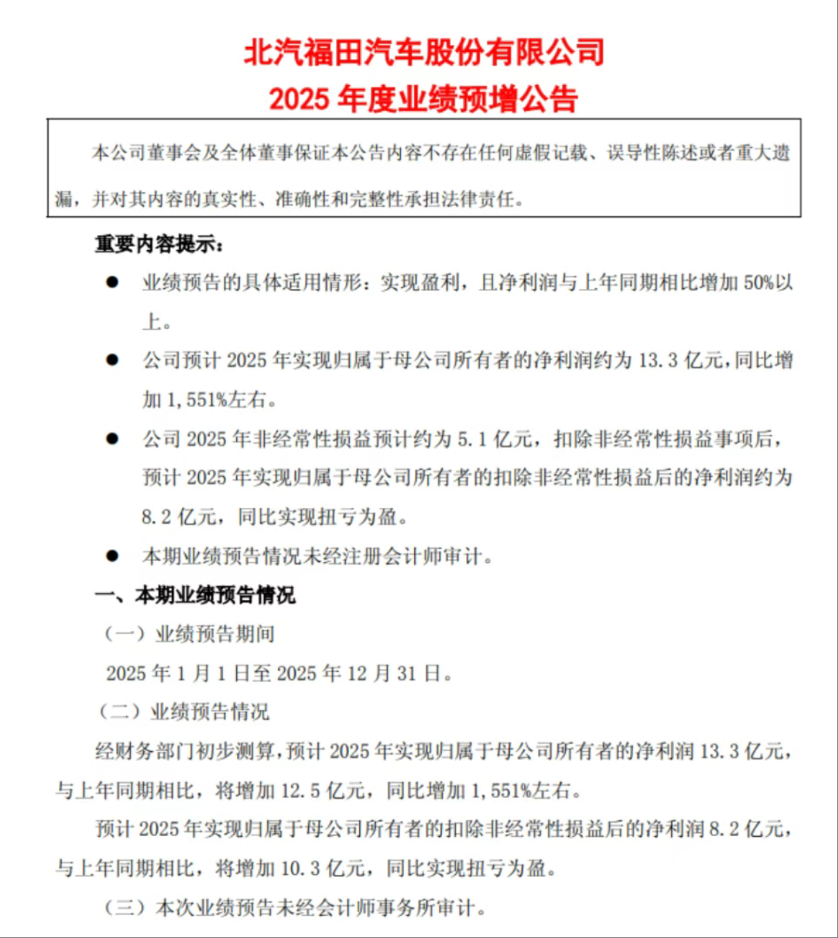 2025年福田汽车业绩预增公告