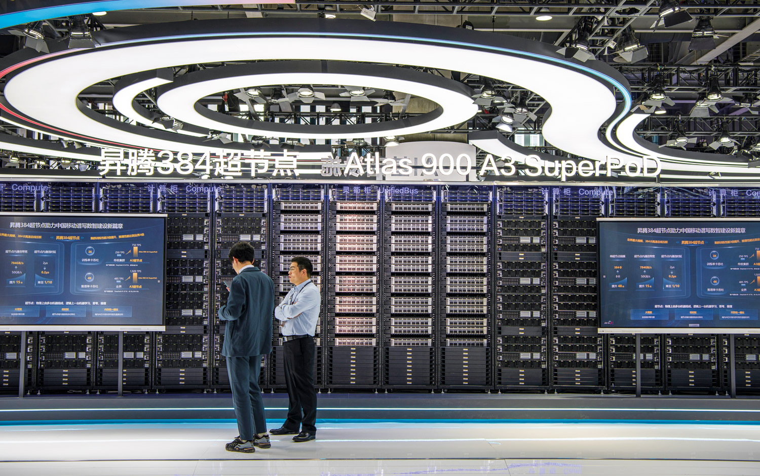 2025年10月,第13届中国移动全球合作伙伴大会上华为公司展出的昇腾384超节点真机Atlas 900 A3 SuperPoD。图/视觉中国