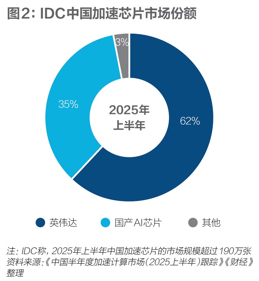国际市场调研机构IDC 2025年10月数据显示,2025年上半年中国加速(即AI芯片)服务器市场规模达到160亿美元,出货超过190万张。其中英伟达约占62%市场份额,国产AI芯片约占35%市场份额。国产AI芯片需求持续增长,增长速度远超英伟达。