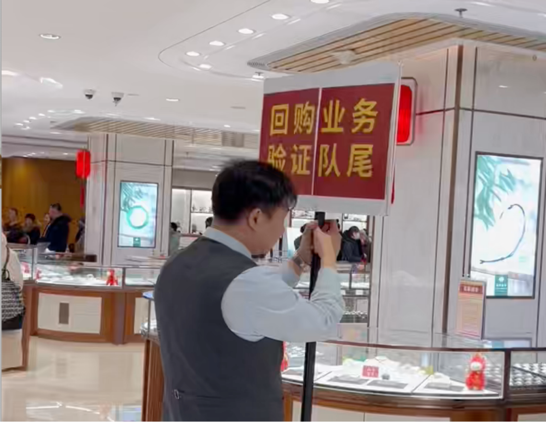 一名商场工作人员手举“回购业务验证队尾”的牌子在现场维持秩序。据其介绍,从接近电梯口的队尾开始排队,预计需要两个小时才能开始办理回购业务。