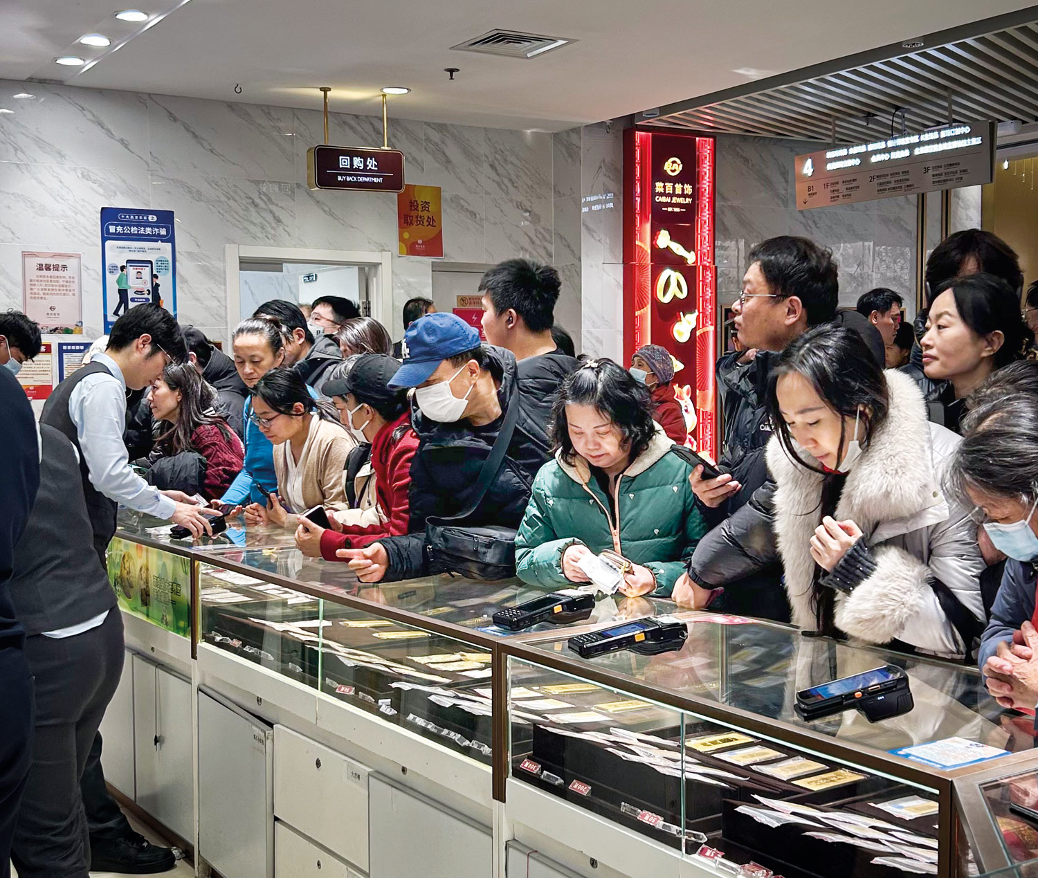 时针指向9时30分,随着大门拉开,人群鱼贯而入,多数径直奔向四楼的投资黄金柜台。狭长的手扶梯上挤满了人。工作人员高声提示,“贴一边走!慢一点,前头有老人!”