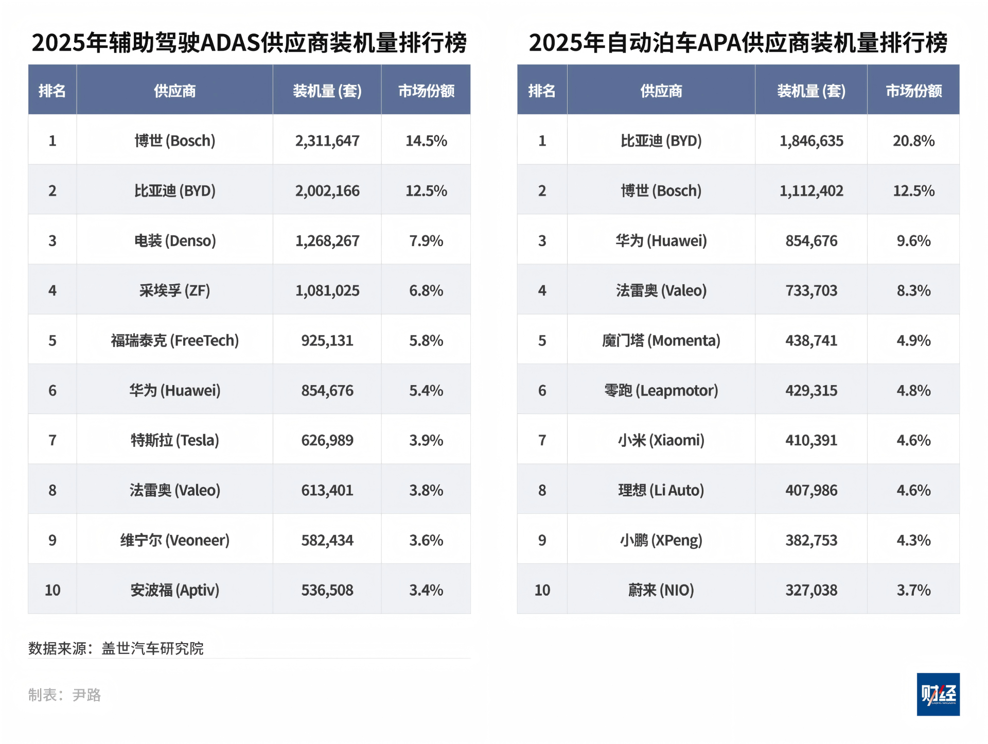 以自动泊车APA供应商装机量排行榜为例,比亚迪凭借垂直整合的自研优势,以20.8%的市场份额超越博世,夺得第一。更值得注意的是,榜单上不只有比亚迪这家以垂直整合著称的车企。零跑、小米、理想、小鹏、蔚来等多家整车厂占据了榜单的半壁江山。这些车企选择绕过供应商,直接自研算法和系统集成,进一步挤压了博世等传统供应商的生存空间。