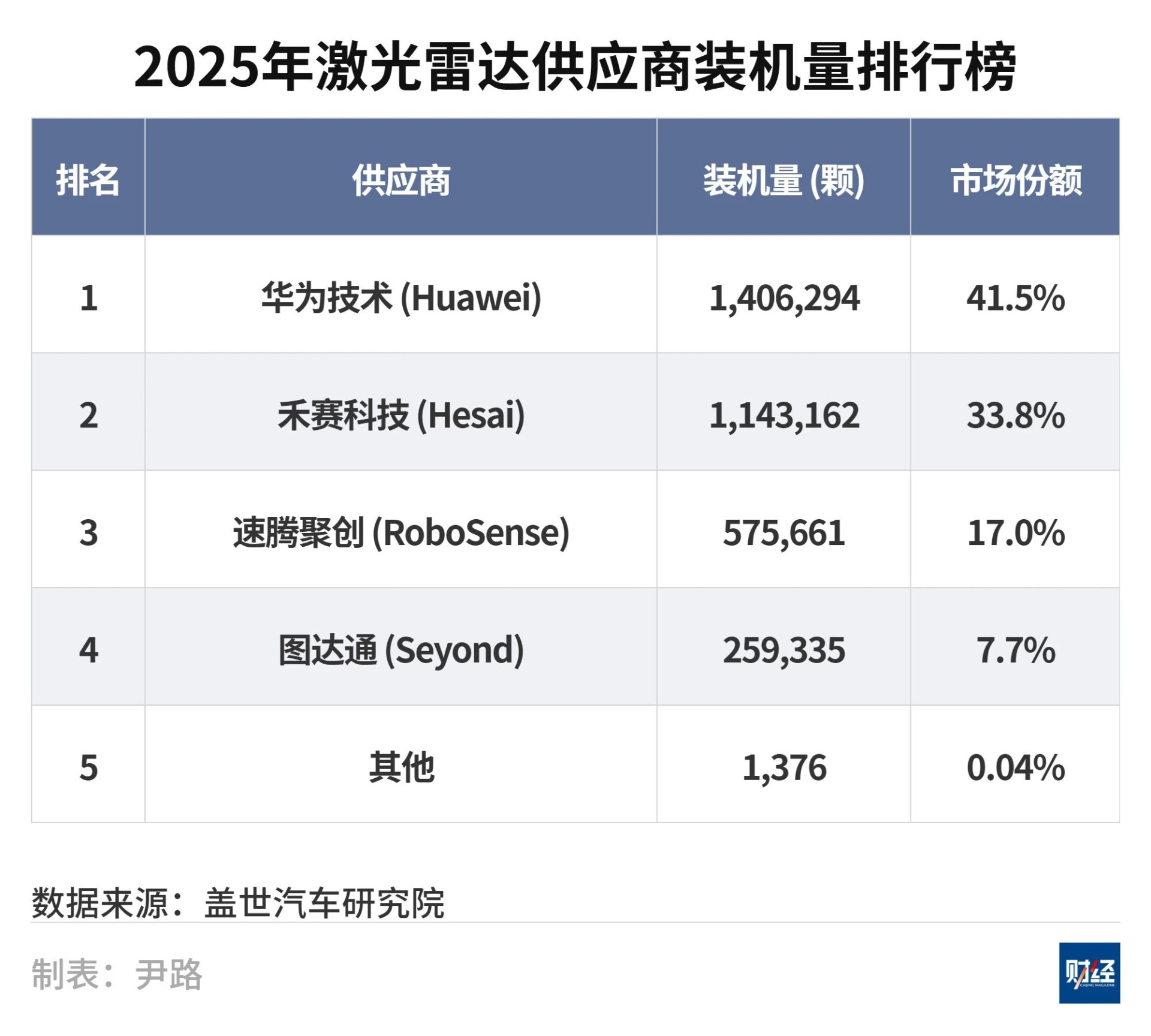在中国的智能驾驶相关供应链中,华为已成为关键厂商之一。根据盖世汽车研究院发布的2025年零部件装车量统计,华为在激光雷达市场以41.5%的份额居于榜首。