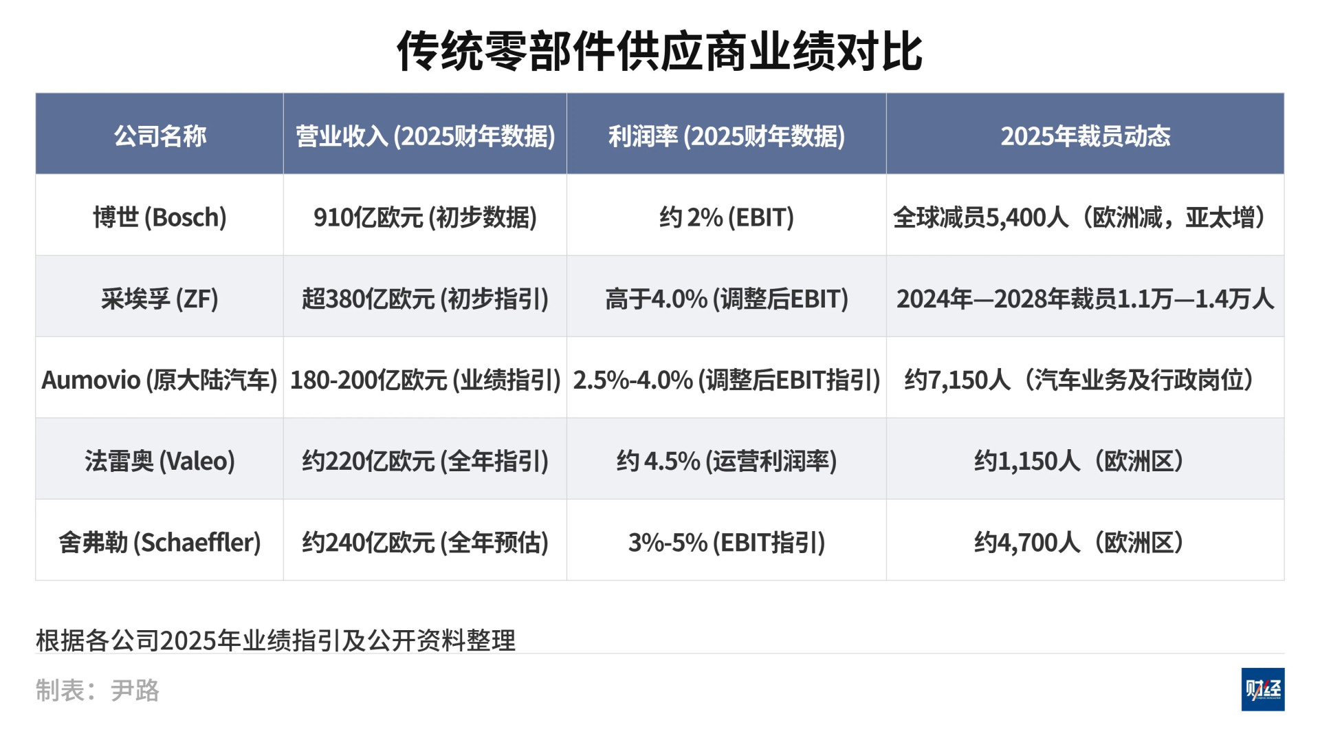 博世的“痛苦”不是个例。2024年—2025年,传统汽车零部件供应商巨头无一例外都陷入了利润下滑和裁员重组的泥潭。采埃孚(ZF Group)计划裁员逾万人,大陆集团(Continental AG)进行了重大拆分,保留利润率超过10%的轮胎业务,而低利润的汽车业务则拆分为Aumovio,法雷奥(Valeo)和舍弗勒(Schaeffler Group)则纷纷收缩欧洲战线。