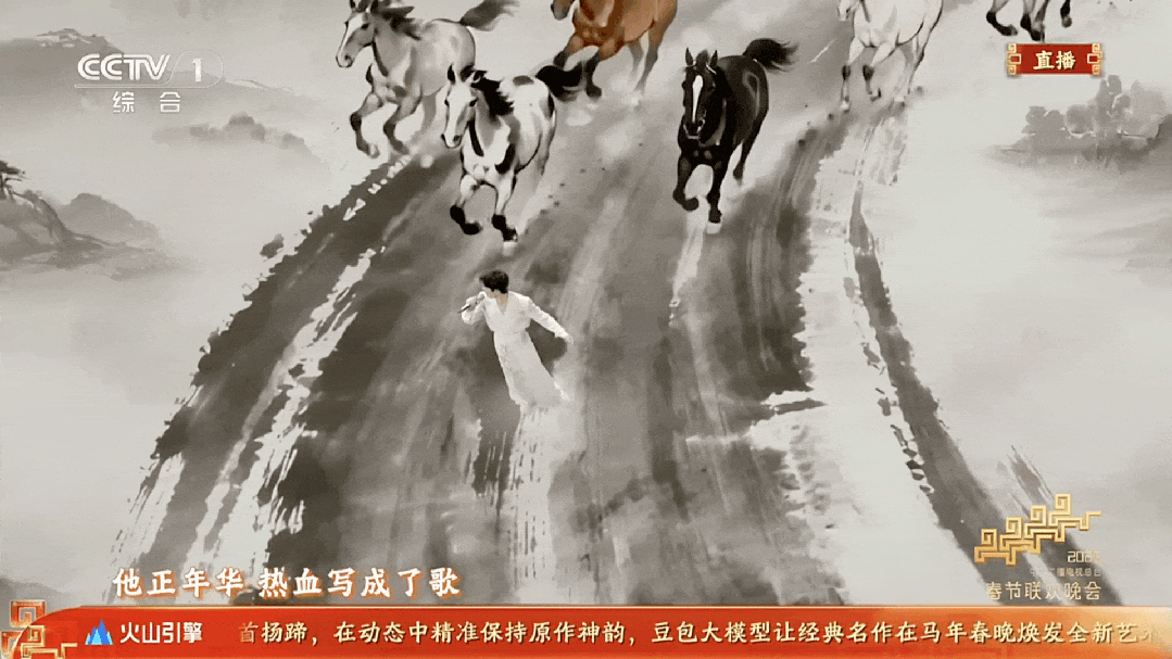 在一众节目之中,《驭风歌》将中国美学的独特风韵展现得淋漓尽致。在豆包视频生成模型Seedance 2.0的勾勒下,舞台化作无垠水墨天地,墨色浓淡随马蹄流转,或浓墨重彩勾勒骏马矫健身姿,或轻描淡写晕染云端缥缈意境。骏马昂首长啸与乐曲共振,马蹄踏过之处墨韵翻涌,群马奔腾的轨迹错落有致,与歌手表演形成巧妙的虚实互动。每一个腾跃、每一次摆尾,都兼具水墨画意在笔先、境生象外的写意之美与动态画面分毫毕现的写实之真。