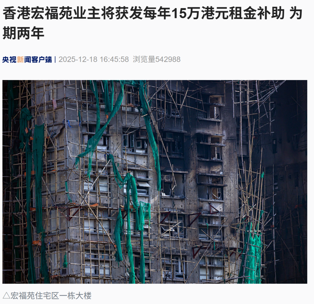 据央视新闻此前报道,香港特区政府2025年12月18日就大埔宏福苑援助基金事宜举行记者会。特区政府政务司副司长卓永兴表示,自2025年12月22日起,会向大埔宏福苑业主发放每年15万港元租金补助及一次性5万港元搬迁补助。租户方面,特区政府会提供一次性5万港元搬迁补助。