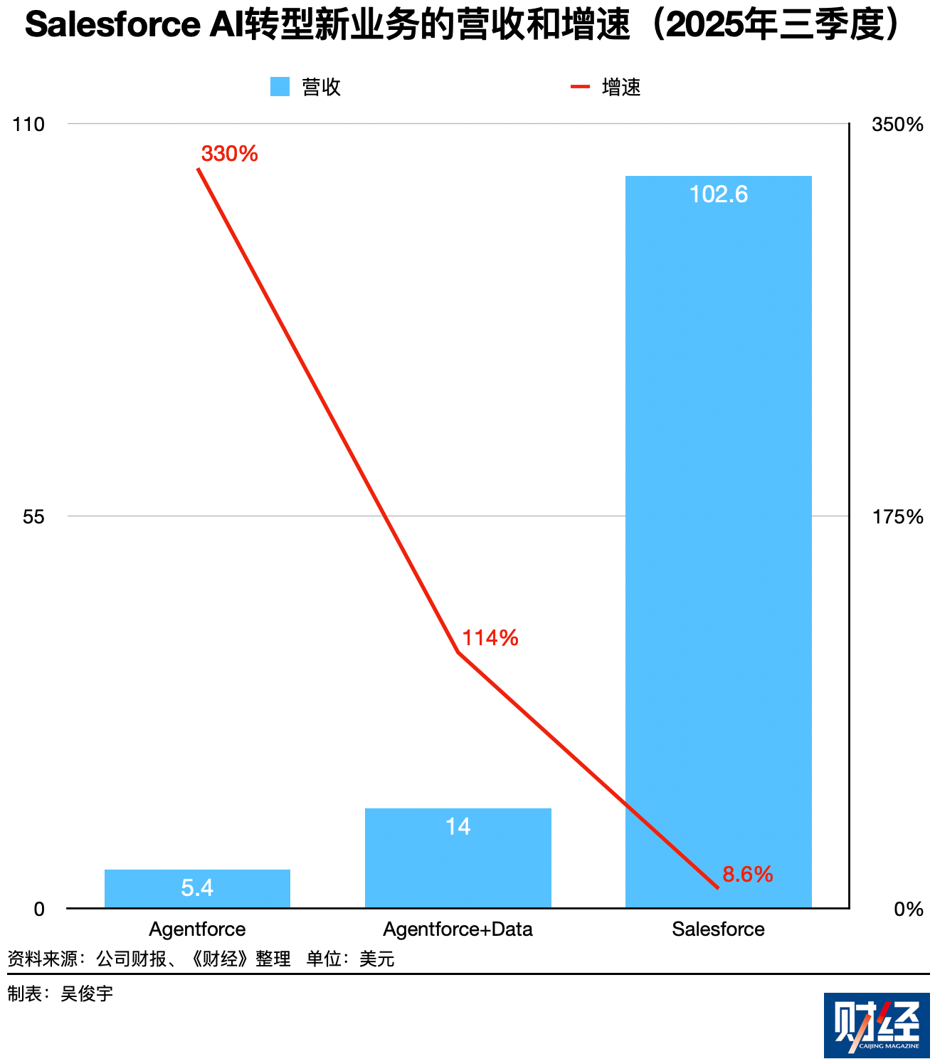 Salesforce的AI转型在业绩上已经初显成效。Agentforce+Data这两款拳头产品在其总营收中的占比已经达到了13.6%。Agentforce+Data当季ARR(年度经常性收入,可理解成订阅收入)接近14亿美元,同比增长114%。其中Agentforce在2025年三季度ARR 5.4亿美元,同比增长330%。