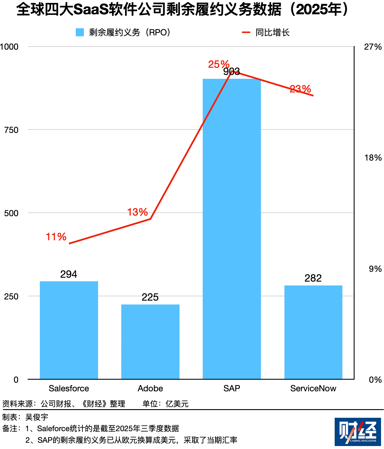 过去一年,即使在“SaaS末日”情绪不断蔓延的阶段,Salesforce、Adobe、SAP、ServiceNow的RPO仍在持续增长,且RPO增速高于当年营收增速。截至2025年末,Salesforce、Adobe、SAP、ServiceNow的RPO营收增速分别是11%、13%、25%、23%。