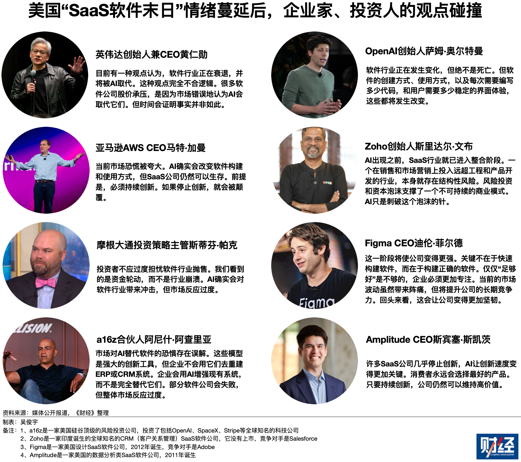 一批硅谷科技领袖、机构投资人也针对“SaaS末日”这种悲观情绪表达了自己的意见。主流观点同样是:当前市场恐慌被夸大,但软件公司的确需要求变。