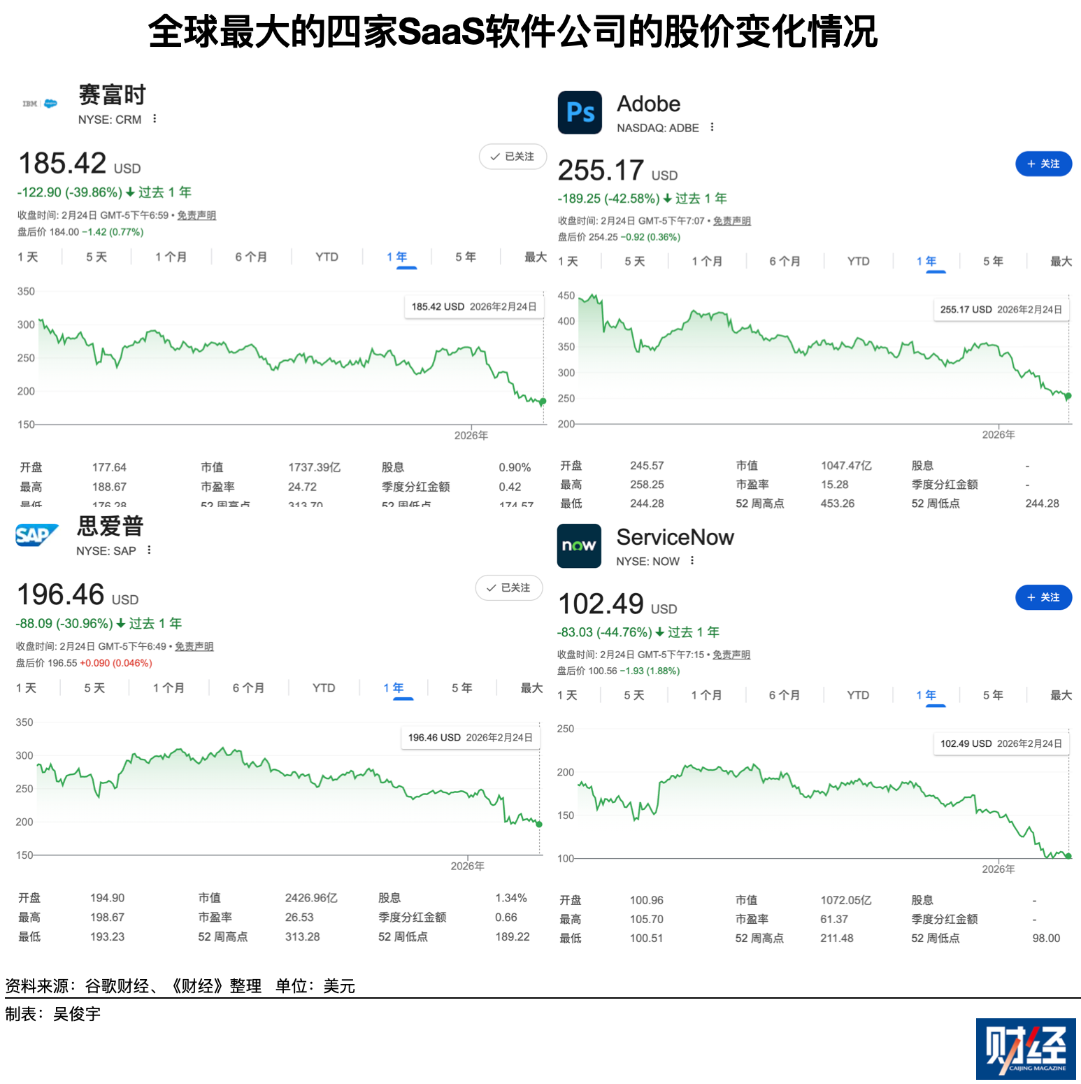 事实上,“软件将被AI颠覆”的悲观情绪早在2025年初就在酝酿。过去一年,美国SaaS软件公司市值一路下跌。Salesforce、Adobe、SAP、ServiceNow在2025年2月24日-2026年2月24日股价均下跌30%以上。Claude Cowork只是让“软件末日”情绪到了爆发临界点。