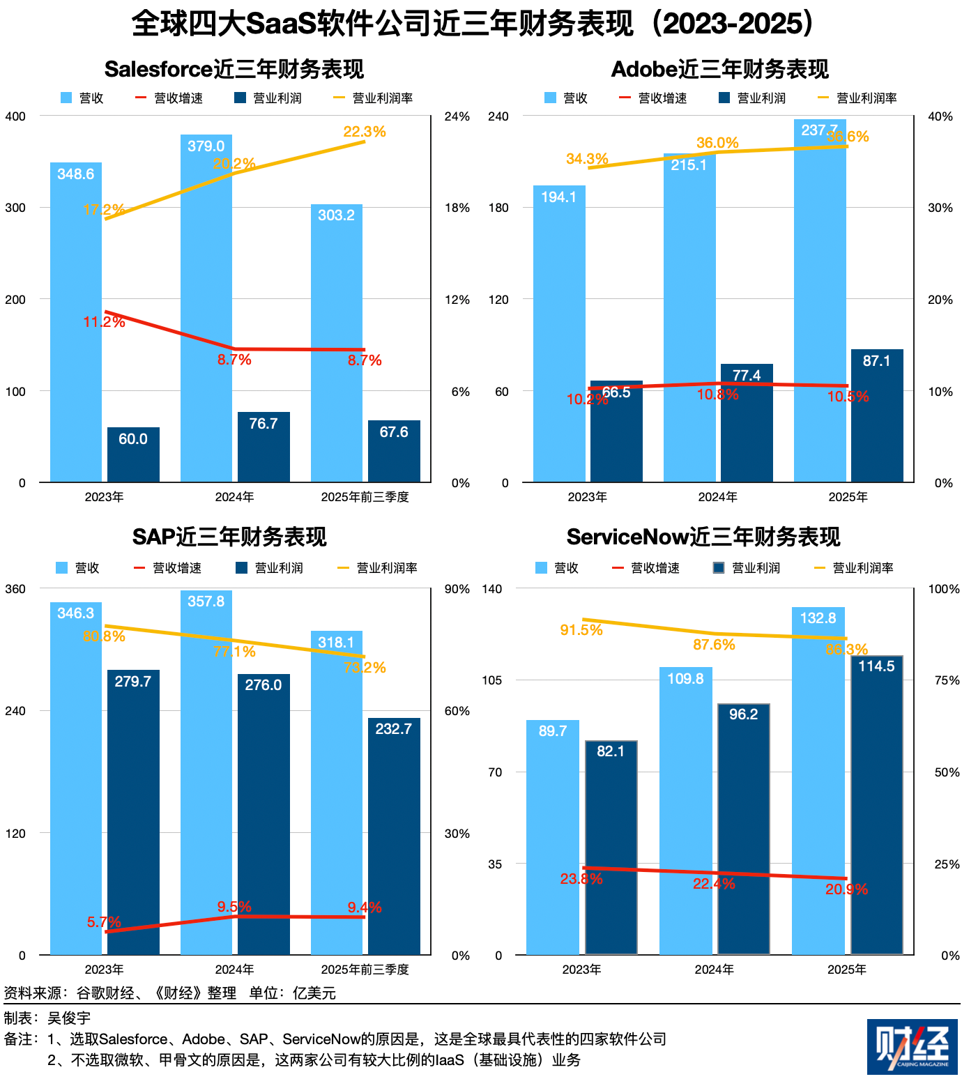 《财经》选取了四家全球最大的老牌SaaS软件公司作为观察切口,它们分别是Salesforce(全球最大的客户关系管理软件)、Adobe(全球最大的创意设计软件)、SAP(全球最大的企业资源管理软件)、ServiceNow(全球最大的流程自动化软件)。