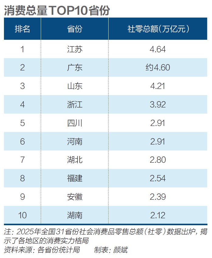 从消费总量看,根据社零由高至低排列,消费前十强省份分别为:江苏、广东、山东、浙江、四川、河南、湖北、福建、安徽、湖南。