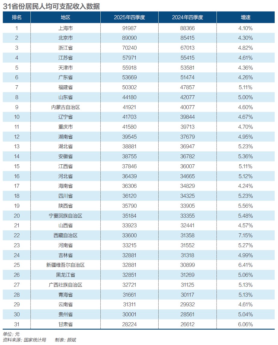 值得留意的是,北京、上海、浙江、江苏和天津等中国前五个高收入地区,都出现了居民人均可支配收入增速低于GDP(国内生产总值)增速的情况,比如2025年上海居民收入比上年增长4.1%,明显低于5.4%的GDP增速,说明居民收入仍有较大增长空间。多地政府都提出,希望2026年将两者增速拉至同一水平。
