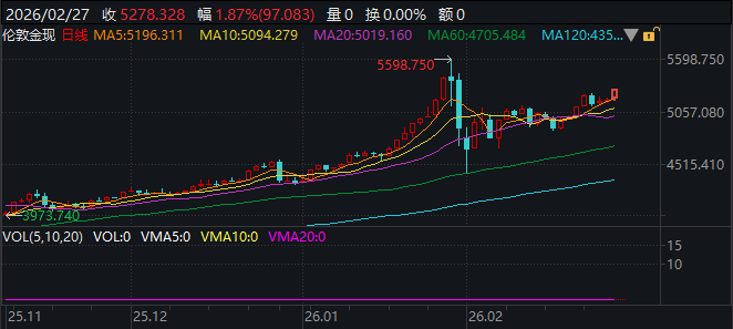 在此之前,美伊局势的加剧已令国际市场避险情绪升温,引爆黄金市场避险核心逻辑。Wind数据显示,2月27日,现货黄金价格已上涨至5278美元/盎司,上涨1.87%。
