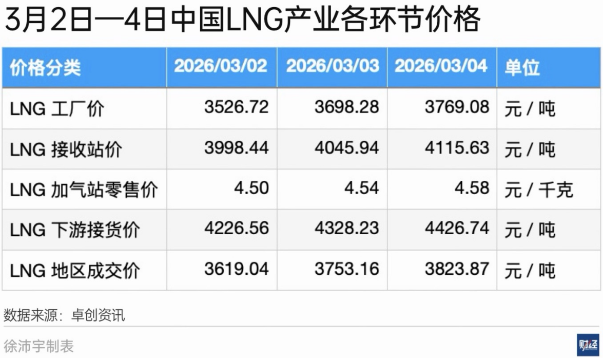 《财经》从多家市场机构了解到,3月4日,中国多地LNG加工厂上调出厂价,山东、江西、安徽等地均价已超过4000元/吨。同时,LNG接收站、零售加气站等LNG产业各环节价格均略有上涨。