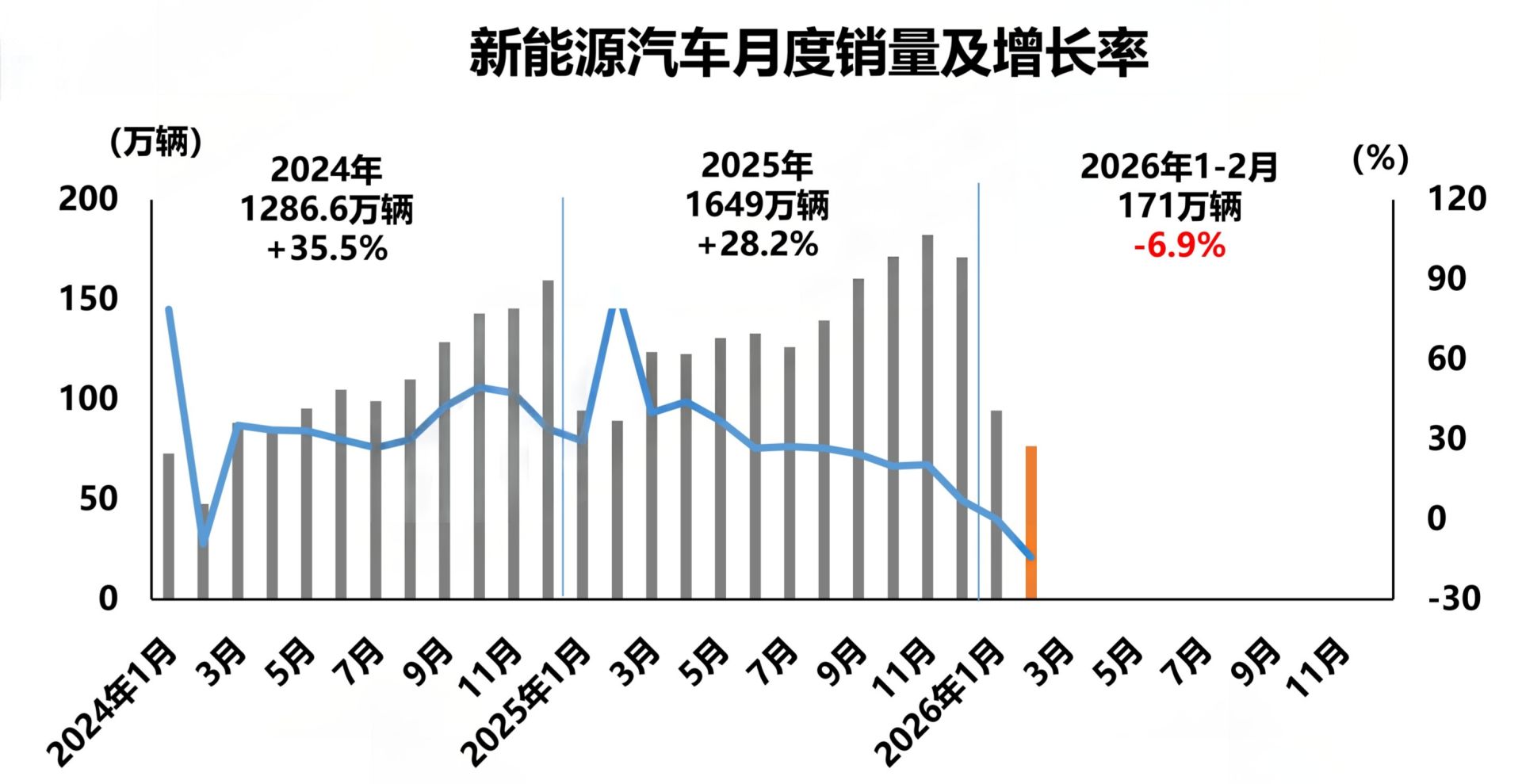 数据显示,2月,我国新能源汽车产销分别完成69.4万辆和76.5万辆,同比分别下降21.8%和14.2%,新能源汽车新车销量占汽车新车总销量的42.4%。1~2月,我国新能源汽车产销分别完成173.5万辆和171万辆,同比分别下降8.8%和6.9%,新能源汽车新车销量占汽车新车总销量的41.2%。