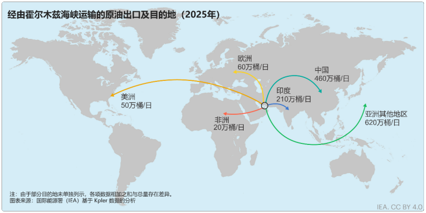 根据IEA统计,2025年有将近1500万桶/日的原油经由霍尔木兹海峡运输,约占全球原油贸易量的34%,其中大部分出口目的地为亚洲。中国和印度合计接收了其中44%的原油出口。IEA成员国有约29%的进口原油经由霍尔木兹海峡,其中日本和韩国尤其依赖经由该海峡运输的石油。该地区约有60万桶/日的原油(仅占4%)输送至欧洲。