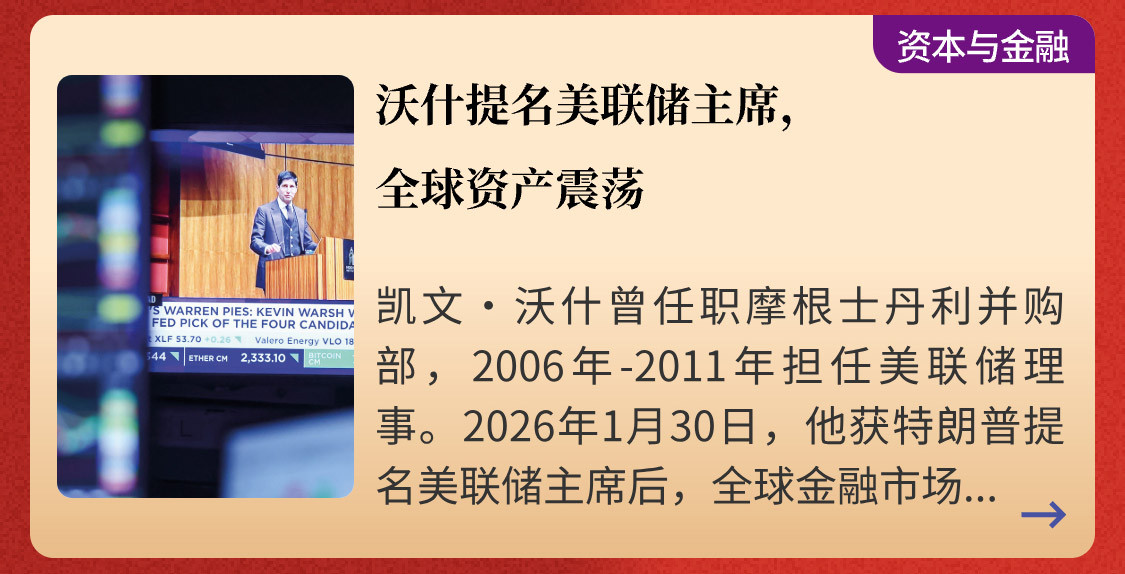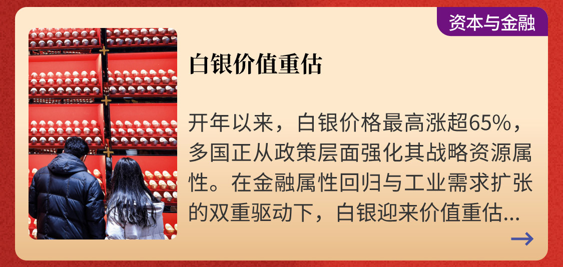 全球资产市场暗流涌动。《沃什提名美联储主席,全球资产震荡》揭示凯文·沃什获提名后全球金融市场的连锁反应;《白银价值重估》记录开年以来白银最高涨超65%,在金融属性回归与工业需求扩张的双重驱动下迎来价值重估;《全球资本增持美债背后》则警示,美债市场未来可能面临更为严峻的供需失衡挑战。