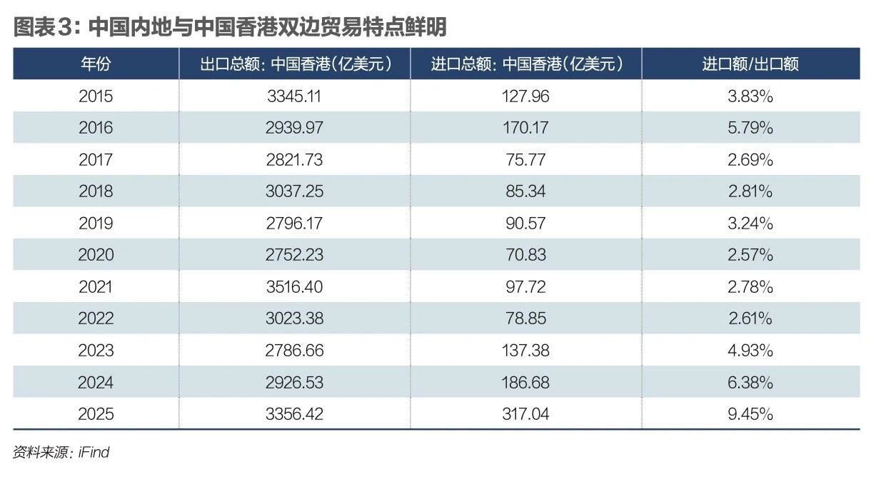 内地与香港之间的双边贸易额呈现鲜明特征,内地对港出口远超过从港进口。图表3是2015年至2025年内地对香港的进出口数据。2025年内地对港出口额为3356.42亿美元,从港进口额为317.04亿美元、仅为出口额的9.45%。这种不均衡特征源于内地通过香港进行大量的转口贸易。