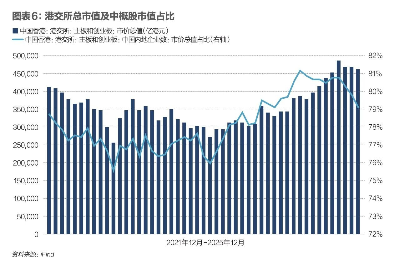 内地企业在港股市场中的占比持续提升,香港市场的基本面日益与内地经济紧密相连。图表6是港股总市值及中概股市值占比。至2025年12月底,香港有2686家上市公司,总市值47.4万亿港元,较2024年底升逾34%。其中,内地企业占港交所主板创业板总市值的79.3%、占整体成交金额比例达90.6%,均与2024年底基本持平。