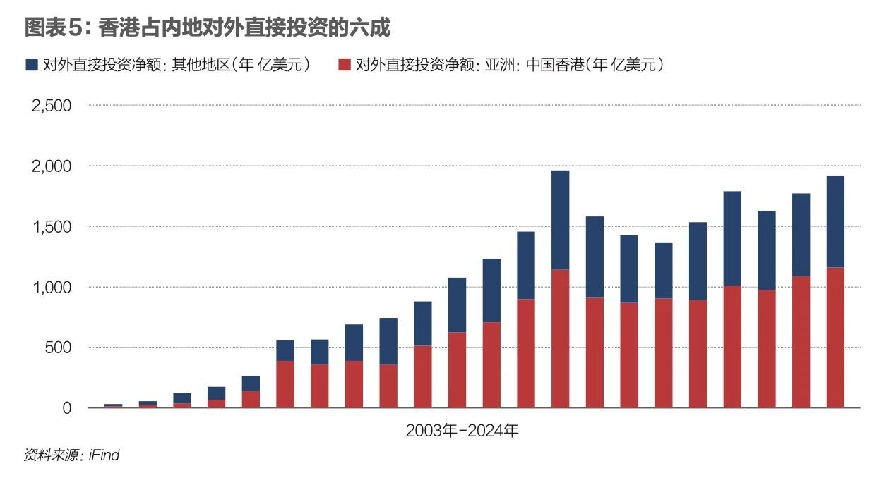 在资本“走出去”的进程中,香港同样承担着关键中转功能。内地企业对外直接投资(ODI)亦大量通过香港进行布局与调度,以利用其国际化的金融环境、法律保障和税务安排。图表5是2003年至2024年内地对香港和其他地区的直接投资净额。这不仅反映香港作为投资目的地的价值,更凸显其作为资金出海、配置全球资产的重要平台作用。