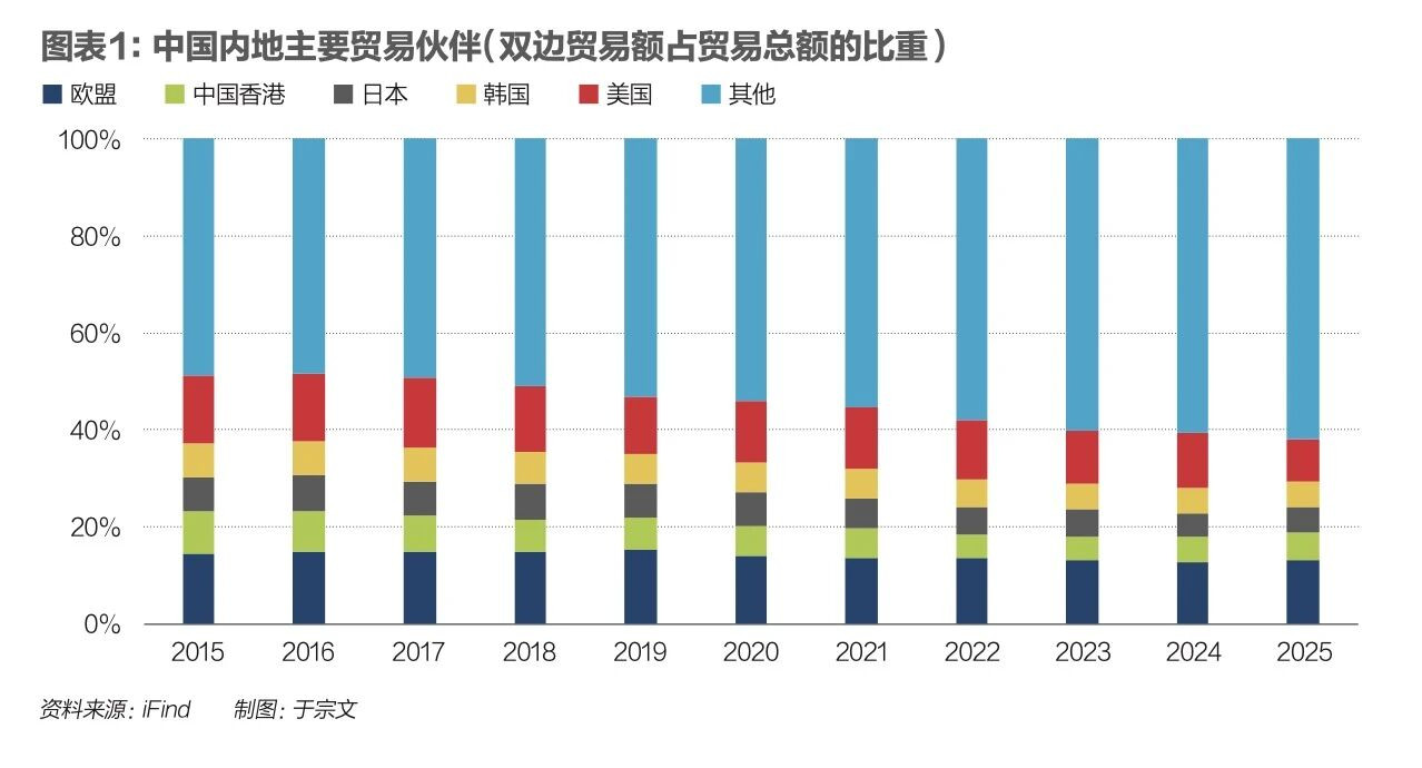 2015年至2025年中国内地主要贸易伙伴双边贸易额占贸易总额的比重(见图表1)。中国香港是内地重要的贸易伙伴。2000年以来,与中国香港的进出口贸易额占内地整体贸易额的比重由11%左右降至约6%。2025年,与中国香港的贸易额占内地整体贸易额的比重为5.73%,仅次于欧盟(13.02%)、美国(8.95%)。