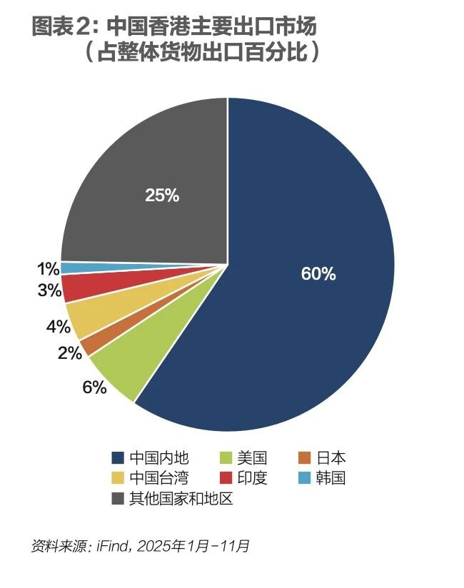 中国香港货物出口中,电子产品占比高达72.8%。这并非指香港本地大量生产电子产品,而是凸显了其作为全球电子产品贸易关键枢纽的角色。香港的出口贸易是典型的转口贸易模式,其竞争力建立在高效的物流、通关和金融服务上,而非本地生产能力。图表2是香港主要出口市场占整体货物出口百分比。香港出口至中国内地的市场占比高达60%,说明内地是香港最核心的贸易伙伴。