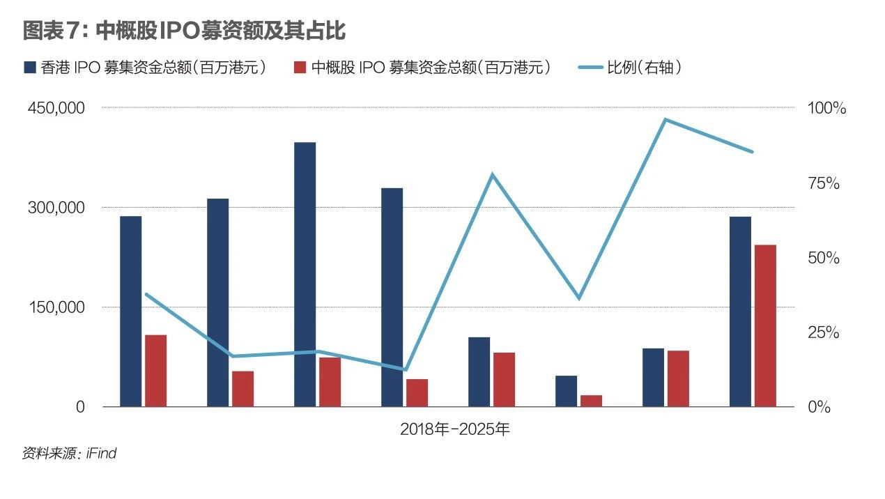 图表7是中概股IPO募资额及其占比。中概股IPO在整个香港IPO中占较大比重。2025年,118家企业在香港上市,其中中概股企业110家,占香港总IPO的93%;中概股IPO融资额为2433亿港币,占香港市场IPO融资额的85%。截至2025年12月,累计共有1552家中概股在港股市场上市。