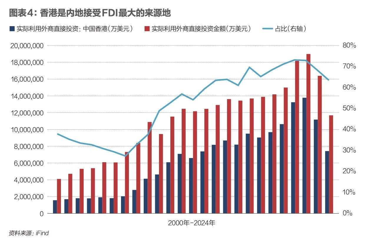 图表4是2000年至2024年中国内地实际使用外资金额和来自香港的金额及其占比。香港作为“超级联系人”,是内地接受外商直接投资最大的来源地。近年来,来自香港的FDI占到了内地实际使用外资总额的60%以上,2021年、2022年更是高达73%。在中国改革开放的前30年,内地吸收的外商直接投资绝大部分通过香港进入。