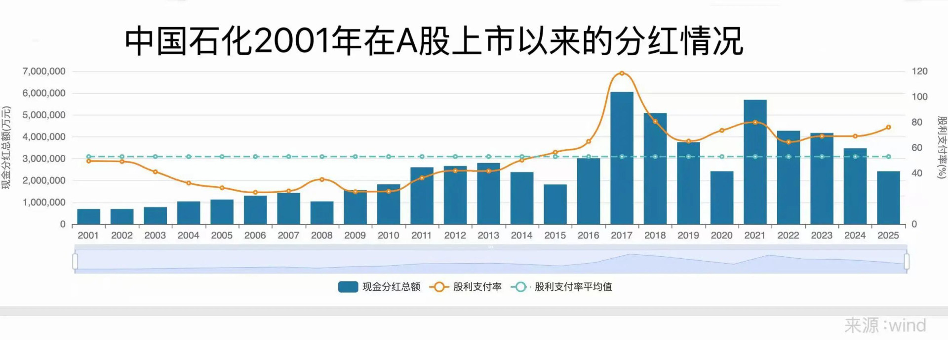 中石化现金分红仍保持较高比例。其年报称,综合考虑公司盈利水平、股东回报和未来发展需要,董事会建议派发末期现金股利每股0.112元(含税),全年派发现金股利每股0.2元(含税)。加上2025年的回购金额,合并计算后其利润分派率(分红/利润)达81%。