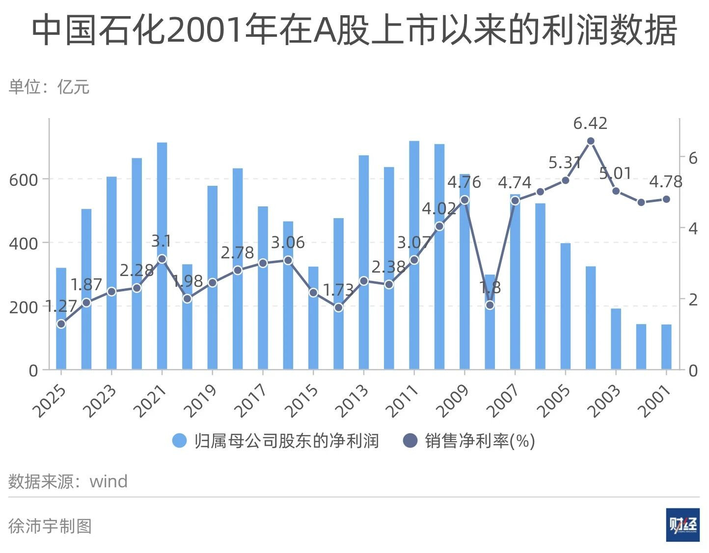 据wind统计,中石化2025年销售净利润率为1.27%,为其2001年在A股上市以来的最低值。中石化2025年的归母净利润额是2008年以来的最低值。