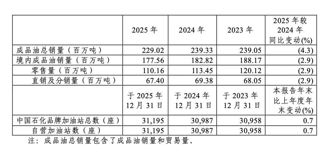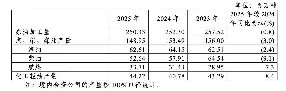 年报显示,2026年中石化全年计划加工原油2.50亿吨,生产成品油1.48亿吨,计划境内成品油销量1.70亿吨。与2025年相比,略有降低。
