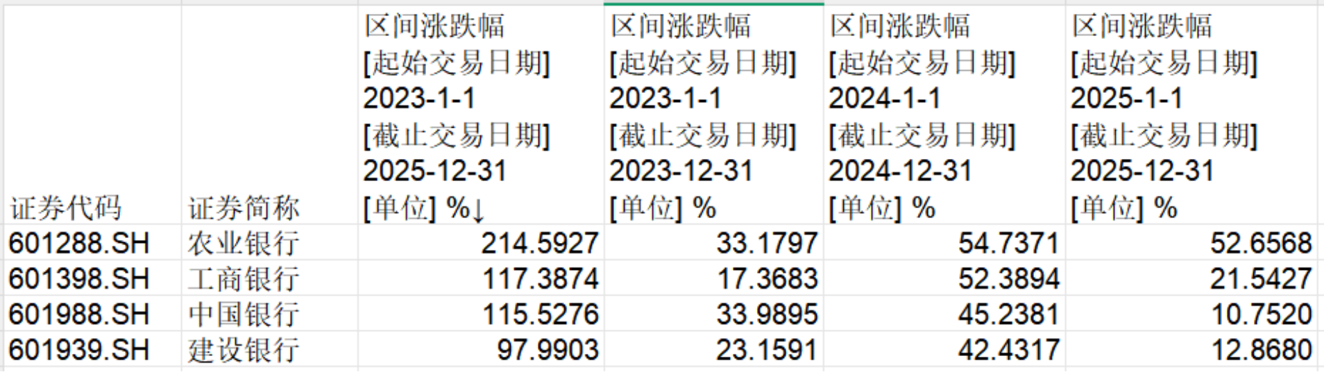 Wind(万得)数据显示,2023年至2025年,农业银行股价上涨幅度215%,工商银行股价涨幅117%,中国银行股价涨幅116%,建设银行股价涨幅98%,在15家多元化上市银行(国有大行+全国性股份制银行)中排名前四位。