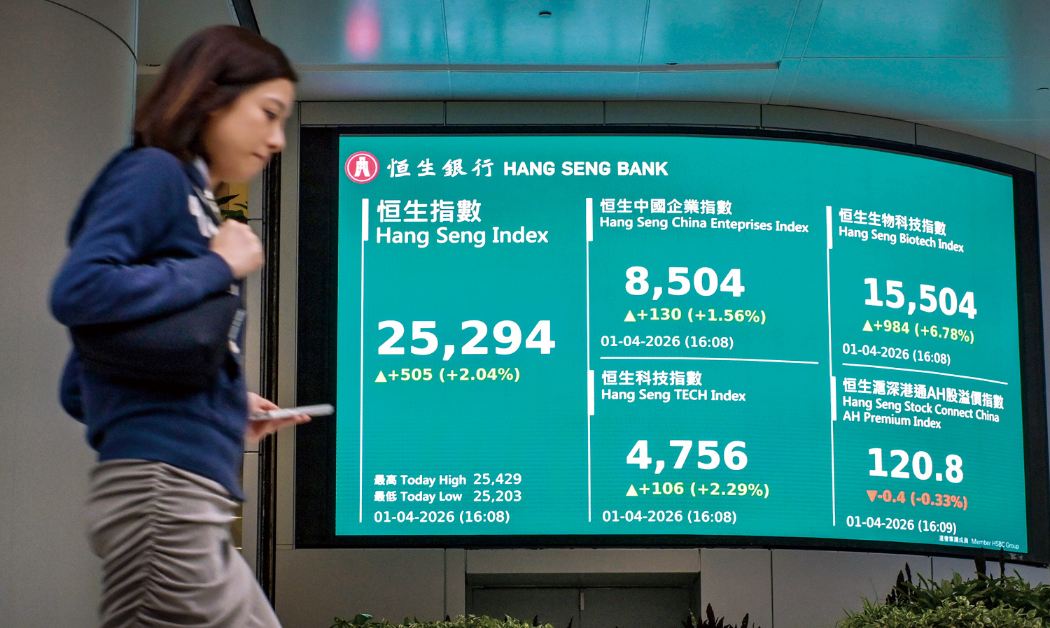 2026年4月1日,恒生科技指数收市报4756.45点。图/中新