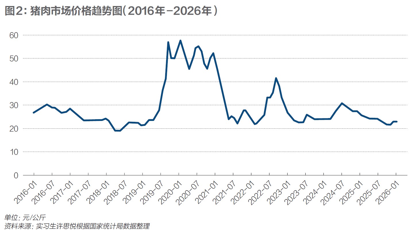 今年3月底的生猪出栏价是2018年6月以来的最低水平。朱增勇向《财经》表示,猪价是由供给和消费需求决定的。季节性消费淡季、中长期消费需求下降叠加生猪供给充裕带动猪价下跌。从需求来看,近年来居民家庭人均猪肉消费量连续两年下降,2025年为26.6公斤,同比下降5.4%;猪肉在肉类消费中的占比由2018年的62%下降到2025年的58%。当前消费又是全年中的最淡季,需求较春节前下降10%-15%。从供给看,全国能繁母猪存栏量从2024年末的4078万头下降至2025年末的3961万头,减少了116万头,但PSY水平(每头母猪年提供断奶仔猪数)2025年提升速度较快,导致2026年一季度生猪供应充裕。