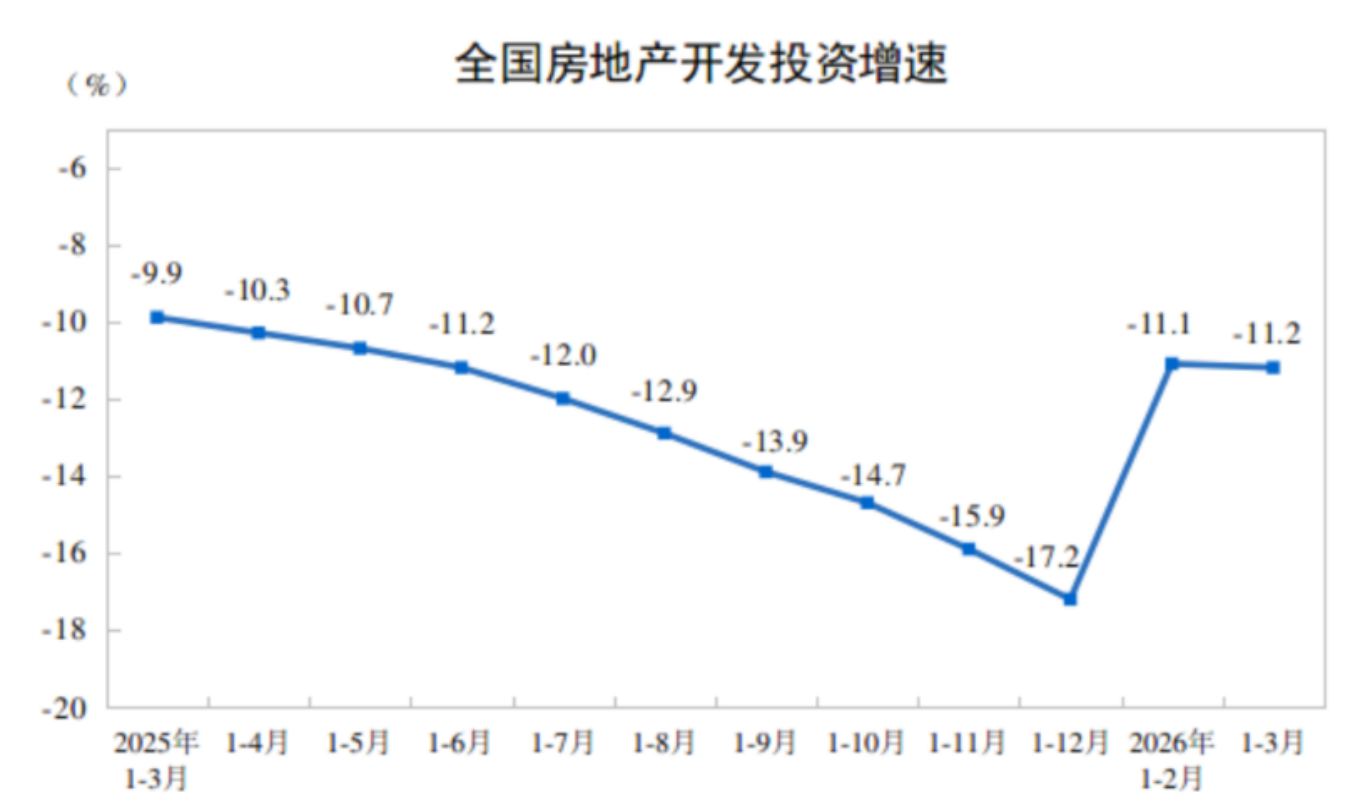 1月至3月,全国房地产开发投资17720亿元,同比下降11.2%,降幅比1月和2月扩大0.1个百分点;其中住宅投资13531亿元,下降11.0%,降幅扩大0.3个百分点。