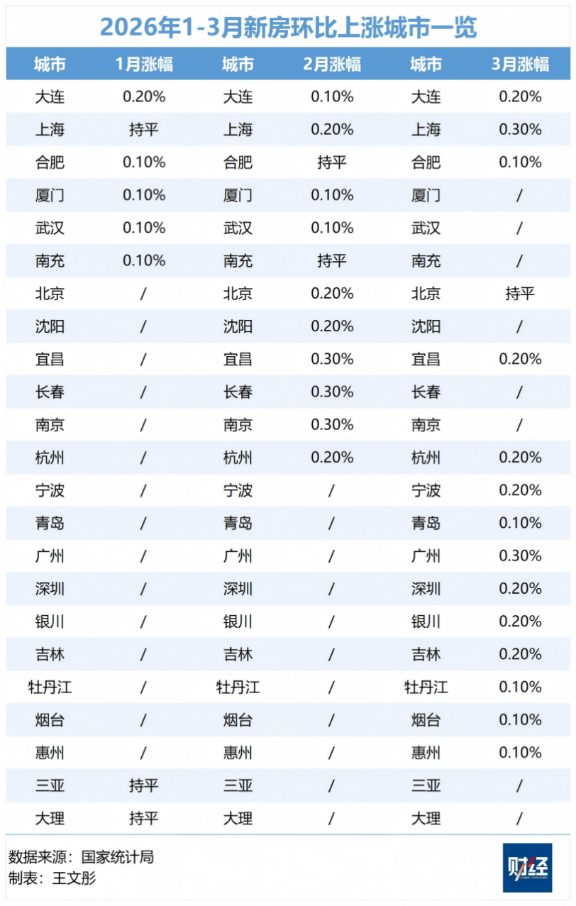 这是一线城市新房价格自2025年5月以来首度录得环比回升。自2026年初以来,一线城市新房价格逐步企稳,1月普遍下跌,2月局部回升,至3月实现整体转正。