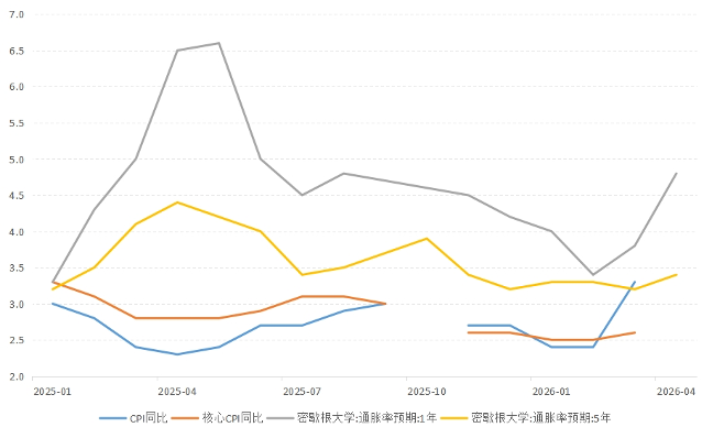 第一,3月美国通胀显著跳升。自2022年以来,美国通胀率一直处于缓慢下行通道。然而,3月CPI同比反弹至3.3%(前值2.4%),明显打乱了去通胀进程。能源价格是其核心推手。受战事冲击,国际原油价格大幅攀升,直接推高3月CPI环比上涨0.9%,创下近四年来最大单月涨幅,其中能源分项贡献了高达四分之三的涨幅。而且,由于能源价格向核心CPI的传导存在时滞,3月核心CPI同比仅温和上升至2.6%。随着时间的推移,后续核心CPI还将进一步上升。