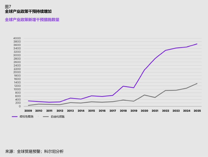 疫情后产业政策扩张的一个显著特征,是歧视性措施占比显著高于自由化措施。歧视性政策多针对进口商品与外资企业,易恶化外商营商环境;而自由化政策旨在扩大开放、降低贸易壁垒。2025年,73%的新增产业政策干预属于歧视性措施,反映出各国政策立场更趋防御。