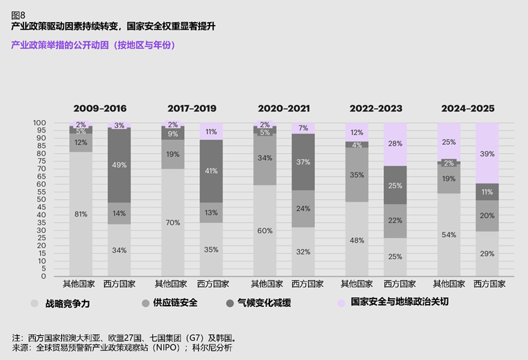 新产业政策观察站(New Industrial Policy Observatory)数据显示,政策制定中的安全考量日益突出。2024年—2025年,西方国家39%的产业政策以国家安全与地缘政治为理由,较2009年—2016年大幅提升36个百分点;其他国家中,25%以国家安全为由,54%以提升战略竞争力为由。