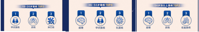 分年龄来看,以太保人寿的理赔报告分析来看,19岁-35岁的重疾前三为甲状腺癌、肺癌和淋巴癌;36岁-55岁的重疾前三为脑梗、甲状腺癌和乳腺癌;56岁及以上重疾前三为脑梗、肺癌和结直肠癌。