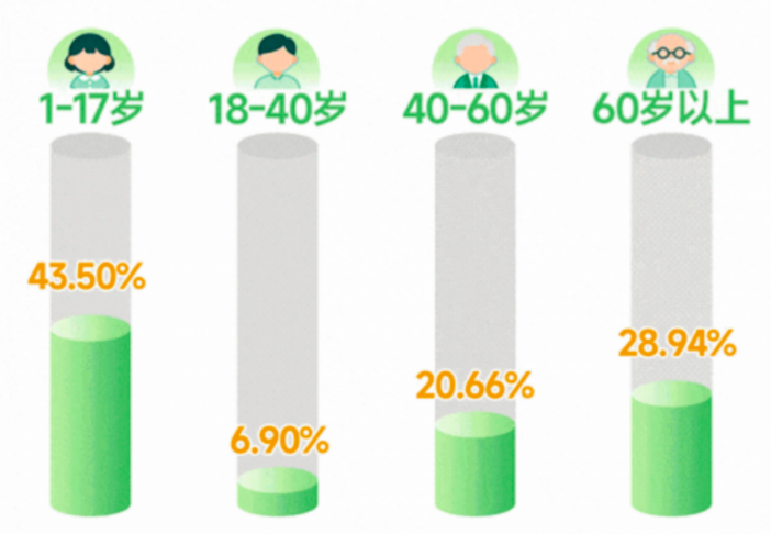 在医疗险的出险年龄分布上,整体呈现“两头高、中间低”的特征。以中邮保险理赔报告为例,1岁-17岁群体因免疫力较弱、自我保护能力不足,成为医疗险出险占比最高的群体;60岁以上老年群体因慢性病高发、行动不便易发生跌倒骨折等意外,出险占比位居第二。