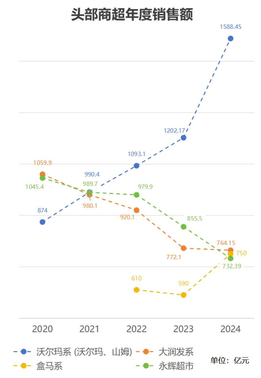 根据中国连锁经营协会的超市百强数据,沃尔玛系已经与传统商超拉开优势,2025年销售额突破1500亿元,其中山姆贡献超过85%。盒马系2021年的未上榜,2022年进入前十,2024年已经是行业第三。
