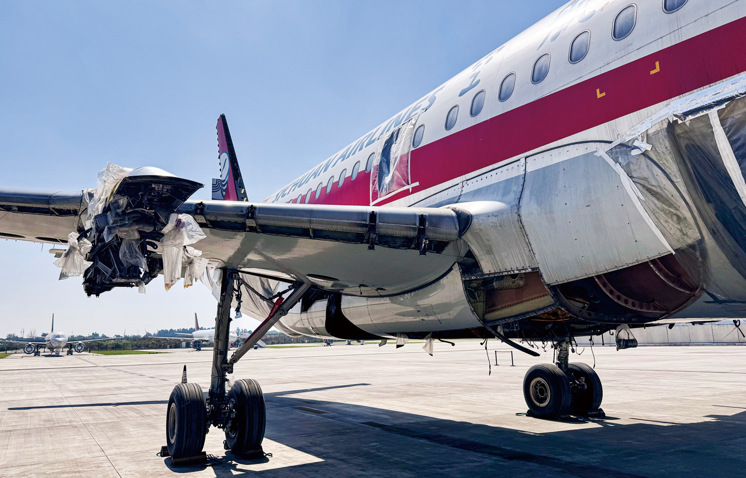 空旷的机坪上,一架飞机静静伫立。不过那似乎已不能称之为飞机了——发动机被摘去,机翼上留下两个管线裸露的孔洞;机头被利落地切下,留下一个整齐的横截面。