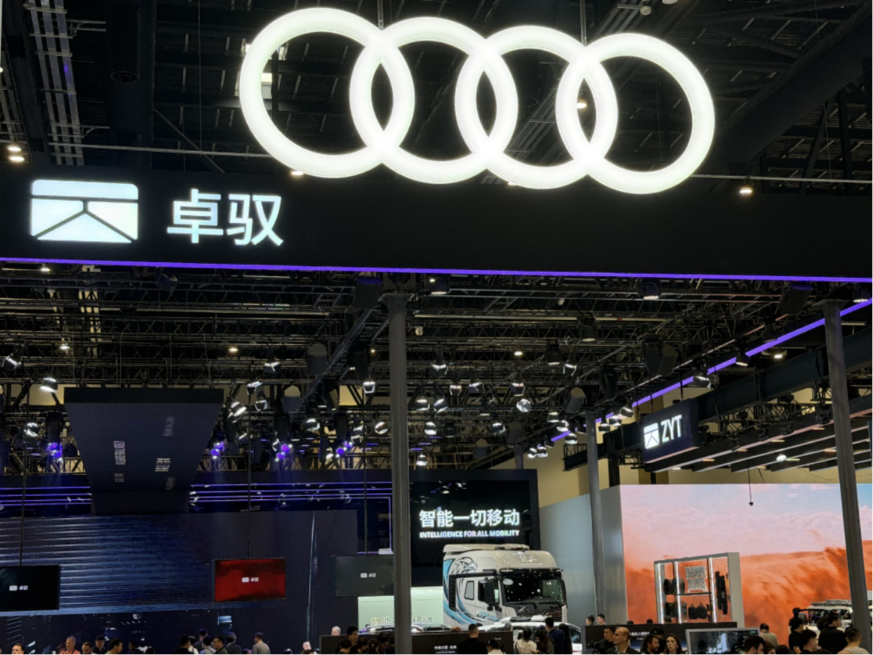 站在A2馆的奥迪展台向南看,左边会看到动力电池供应商亿纬锂能的展台,右边则是智能驾驶企业卓驭科技的展台。