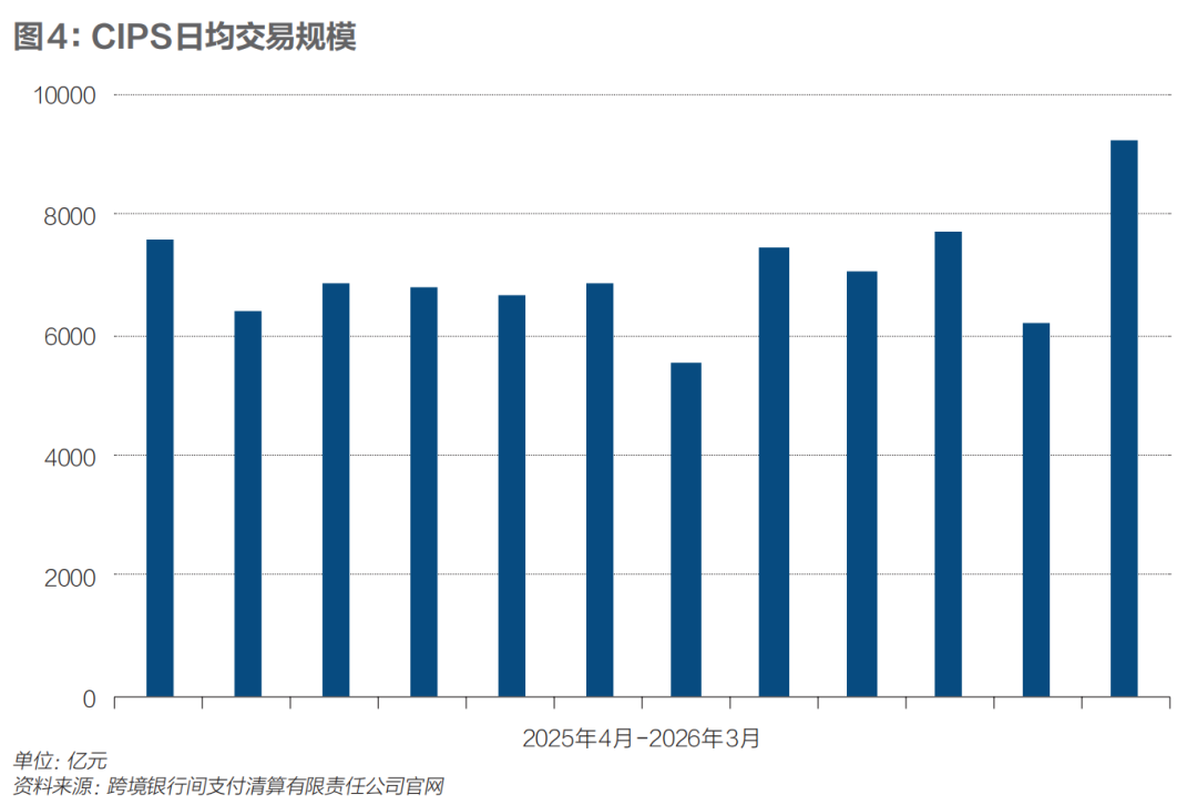 跨境银行间支付清算公司数据显示,2026年3月,人民币跨境支付系统(CIPS)日均交易规模达9205亿元,交易笔数3.574万笔,较2月的6197亿元、2.593万笔大幅攀升,创近12个月峰值。