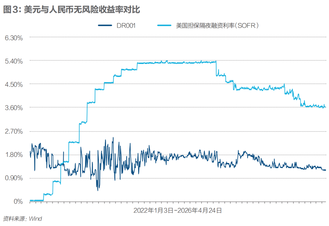 Wind数据显示,截至2026年4月21日,美元无风险收益率(SOFR)约为3.63%,而人民币近似无风险收益率(DR001)仅为1.22%,利差超过2个百分点。